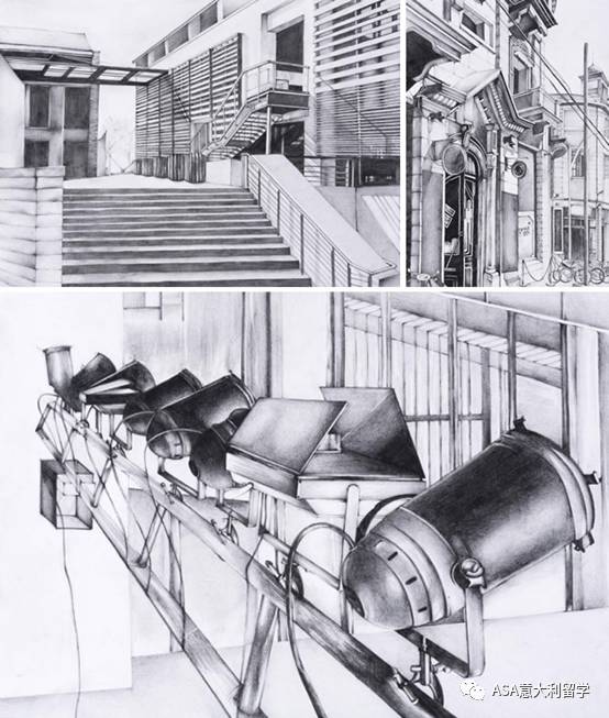 这是新西兰奥克兰大学建筑学院某名录取学生的作品集案例,可以看到,即便是底下这幅对聚光灯的素描写生,也能看出这位同学对建筑结构的强烈兴趣。