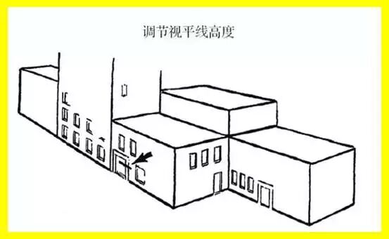 降低视平线至前页门上的标记,以此为基础做出这组楼群的透视图。两消失点在视平线上的相对位置和之前一样。可以看到画面中垂直的直线的方向没有发生变化,而水平方向的直线却因视平线的改变而较之前的透视有所不同。通过抬高或降低我们的视平线高度,我们可以得到这组楼群的不同角度的透视图。