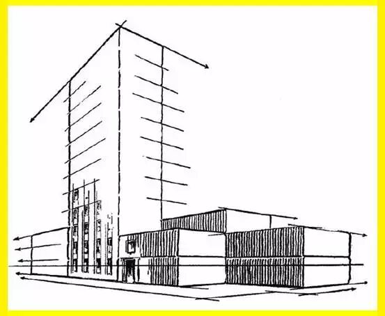 砖块侧面相接,首尾相连。再在上面加更多的砖块,堆叠出高度各不相同的“大楼”。因而,经过视平线上的两个透视点就可以做出这座大楼的透视图。