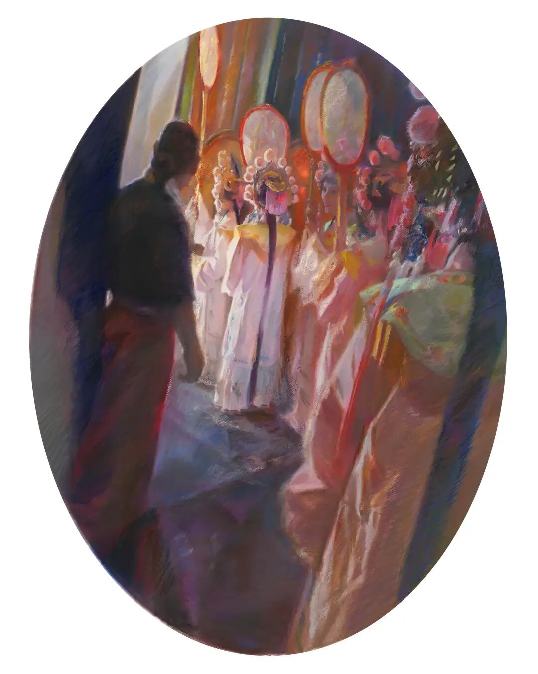 第二是绘画语言对光影的追随。《觅》创作于学生时代,以“窥看”视角捕捉舞台背后的光彩与浪漫,以强烈的形式刻画“群场流动”。后来的《光影记:游园惊梦》着重表现演员出场时台上光线将亮未亮的光感,以及幕后人流涌动中的光的戏剧,呈现出浪漫鬼魅的气质。